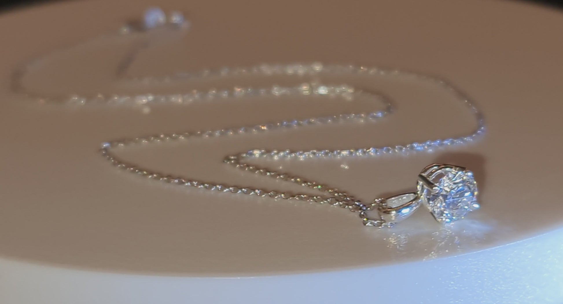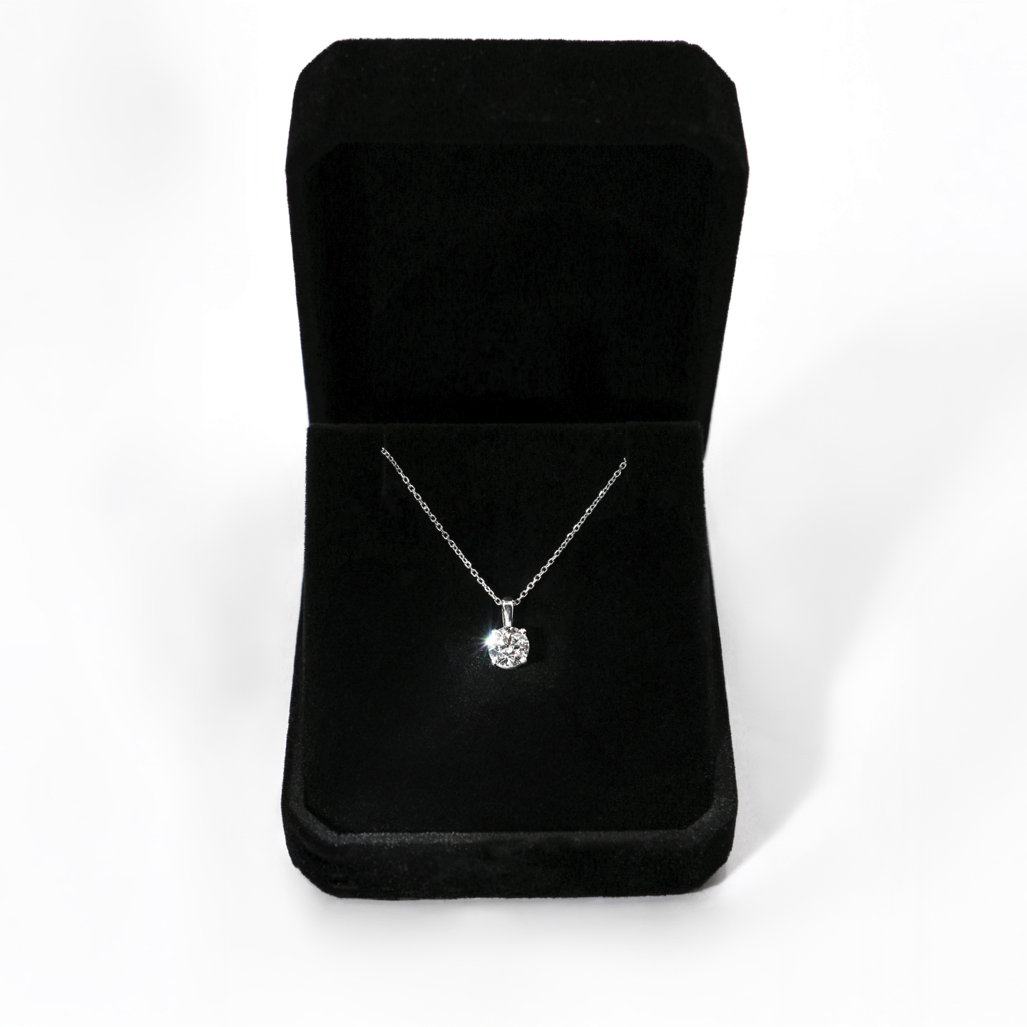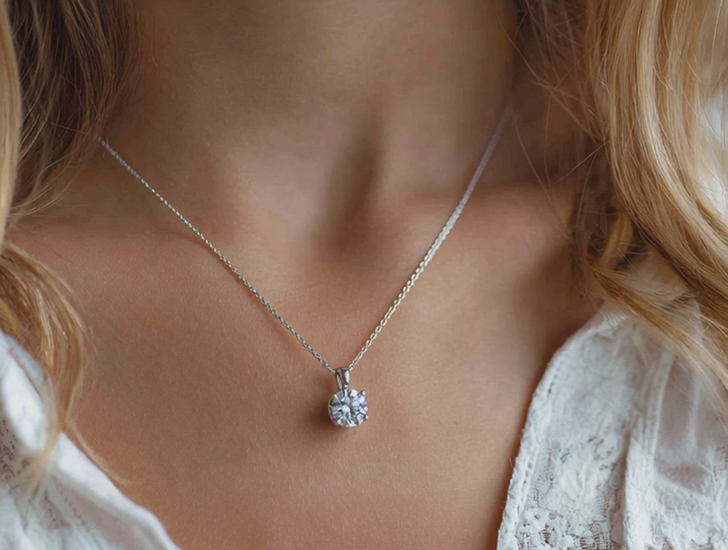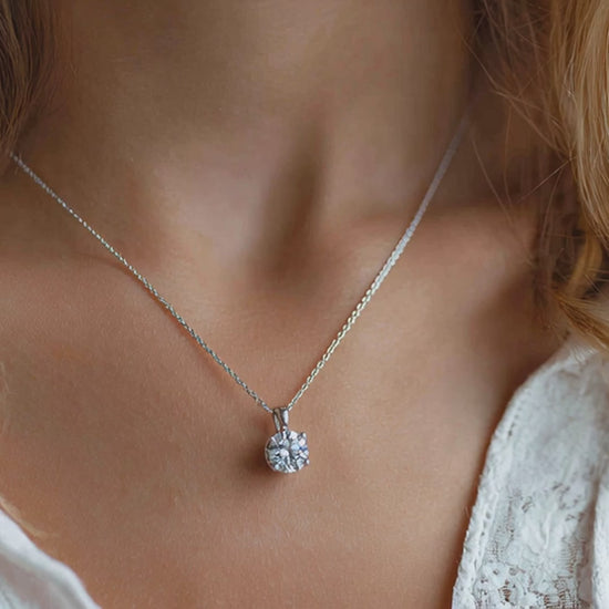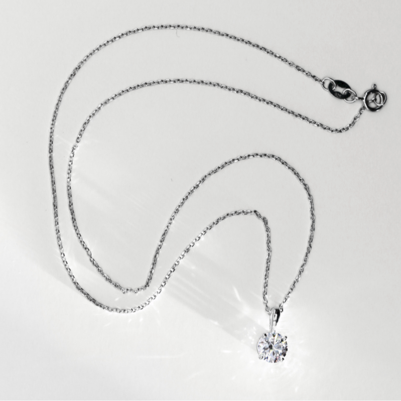 Един-единствен кръгъл диамант, деликатно окачен, улавя светлината при всяко движение. Нежно, изискано, запомнящо се.